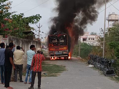 हाई बोल्टेज करंट की चपेट में आया ट्राई साइकिल लोडकर जा रहा ट्रक,करंट से ट्रक में लग गई आग,ट्रक चालक और क्लीनर गंभीर झुलसे