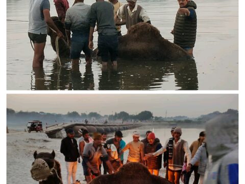 गोबर खाद लेकर गंगा नदी पार कर रहा ऊंट नदी की छोटी धारा में फंसा,कड़ी मशक्कत के बाद ऊंट का किया गया रेस्क्यू