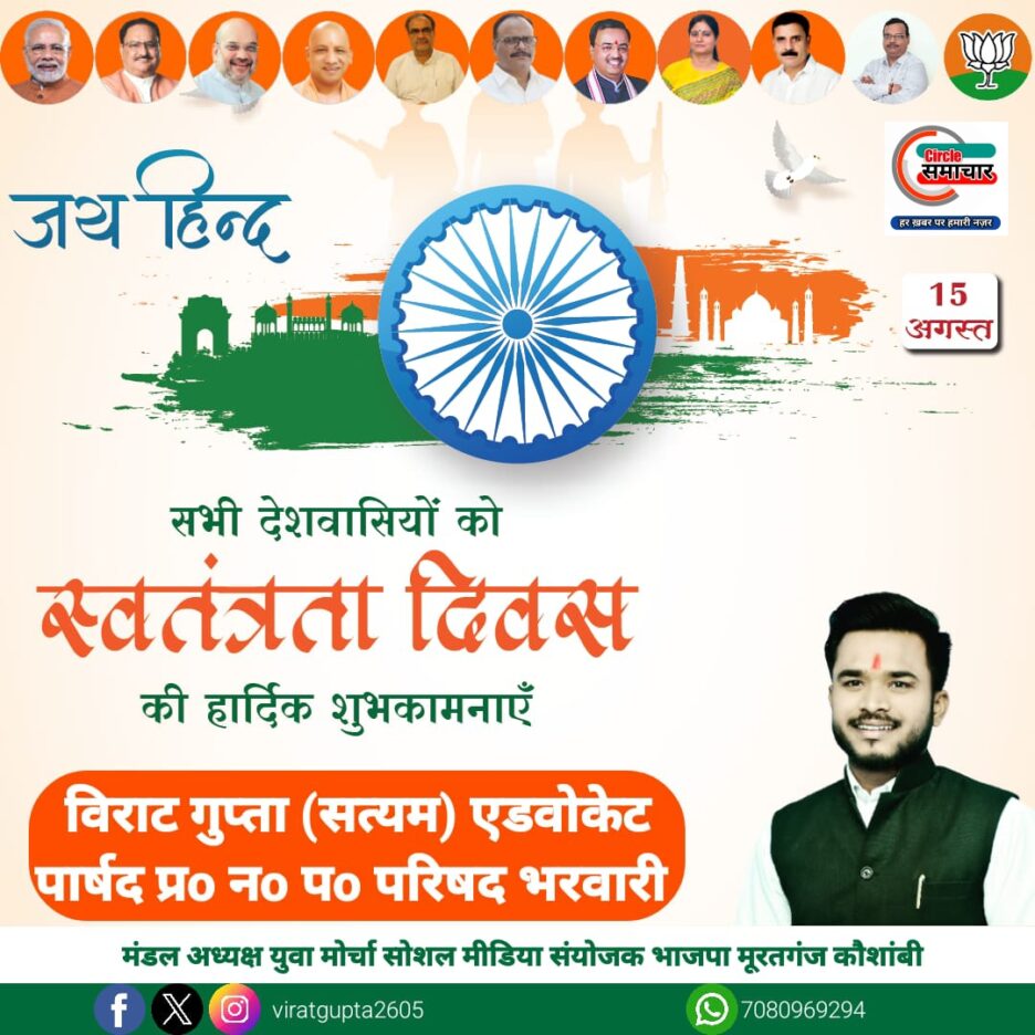 नगर पालिका परिषद भरवारी के वार्ड 25 के सभासद प्रतिनिधि विराट गुप्ता की तरफ से स्वतंत्रता दिवस की हार्दिक शुभकामनाएं,