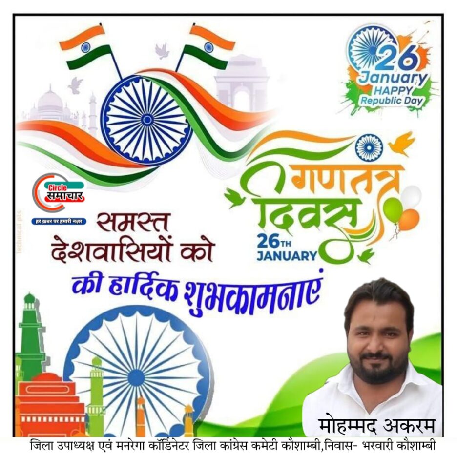 गणतंत्र दिवस: कांग्रेस पार्टी के जिला उपाध्यक्ष एवं मनरेगा कॉर्डिनेटर कौशाम्बी मोहम्मद अकरम की तरफ से सभी जनपदवासियों को गणतंत्र दिवस की हार्दिक शुभकामनाएं,