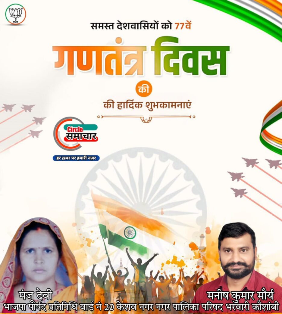 गणतंत्र दिवस: मंजू देवी पत्नी मनीष कुमार मौर्य पार्षद वार्ड 20 केशव नगर भरवारी की तरफ से सभी जनपदवासियों को गणतंत्र दिवस की हार्दिक शुभकामनाएं,