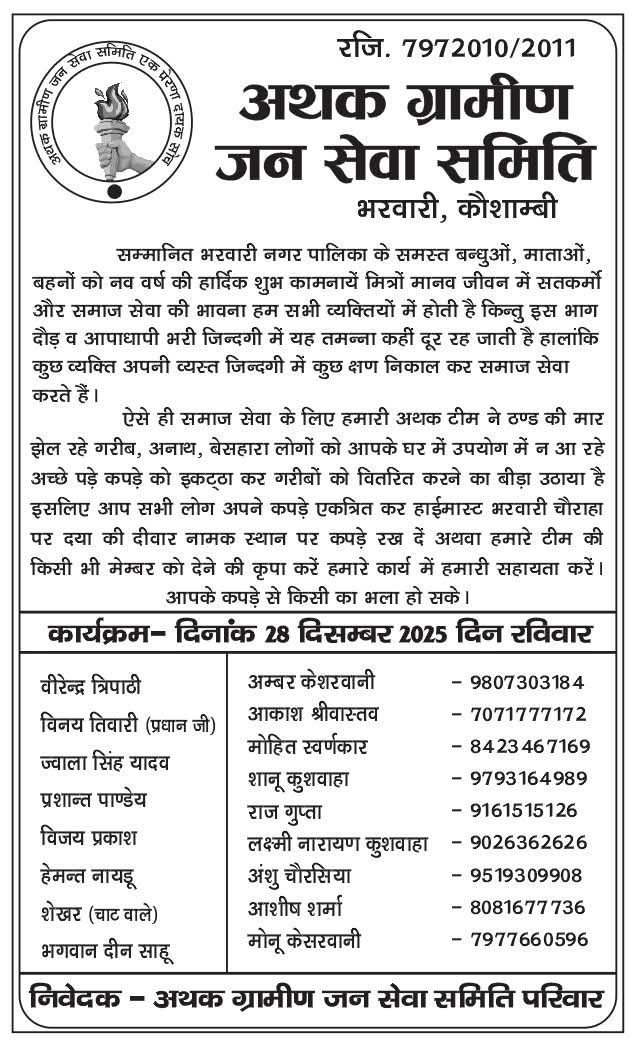 यूपी के कौशाम्बी जिले के नगर पालिका परिषद भरवारी में आज रविवार को गरीबों, असहायों को ठंड से बचाने के लिए अथक ग्रामीण जन सेवा समिति की टीम निःशुल्क शिविर लगाकर गर्म कपड़े वितरित करेगी, इस शिविर मे लोगों के घर में प्रयोग में नही लाए जाने वाले कपडे ,स्वेटर आदि को एकत्रित कर निर्धन एवम असहाय लोगो को वितरित किया जाएगा।