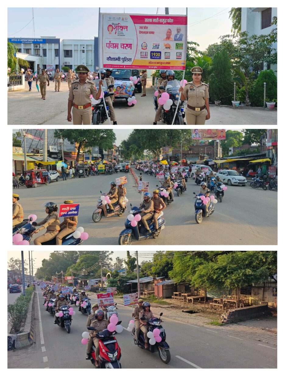 यूपी के कौशाम्बी जिले में शासन द्वारा चलाए जा रहे नारी सुरक्षा, सम्मान एवं स्वावलंबन के लिए समर्पित मिशन शक्ति ( फेज-05 ) के विशेष अभियान के क्रम में रविवार को मंझनपुर मुख्यालय स्थित एसपी ऑफिस से नवरात्रि की पूर्व संध्या पर जनपद में तैनात महिला पुलिस कर्मचारियों द्वारा स्कूटी रैली निकाली गयी। जिसका भ्रमण पूरे मंझनपुर मुख्य सहित पांच किलोमीटर क्षेत्र में हुआ। स्कूटी रैली का समापन देर शाम पुलिस ऑफिस में ही हुआ।
