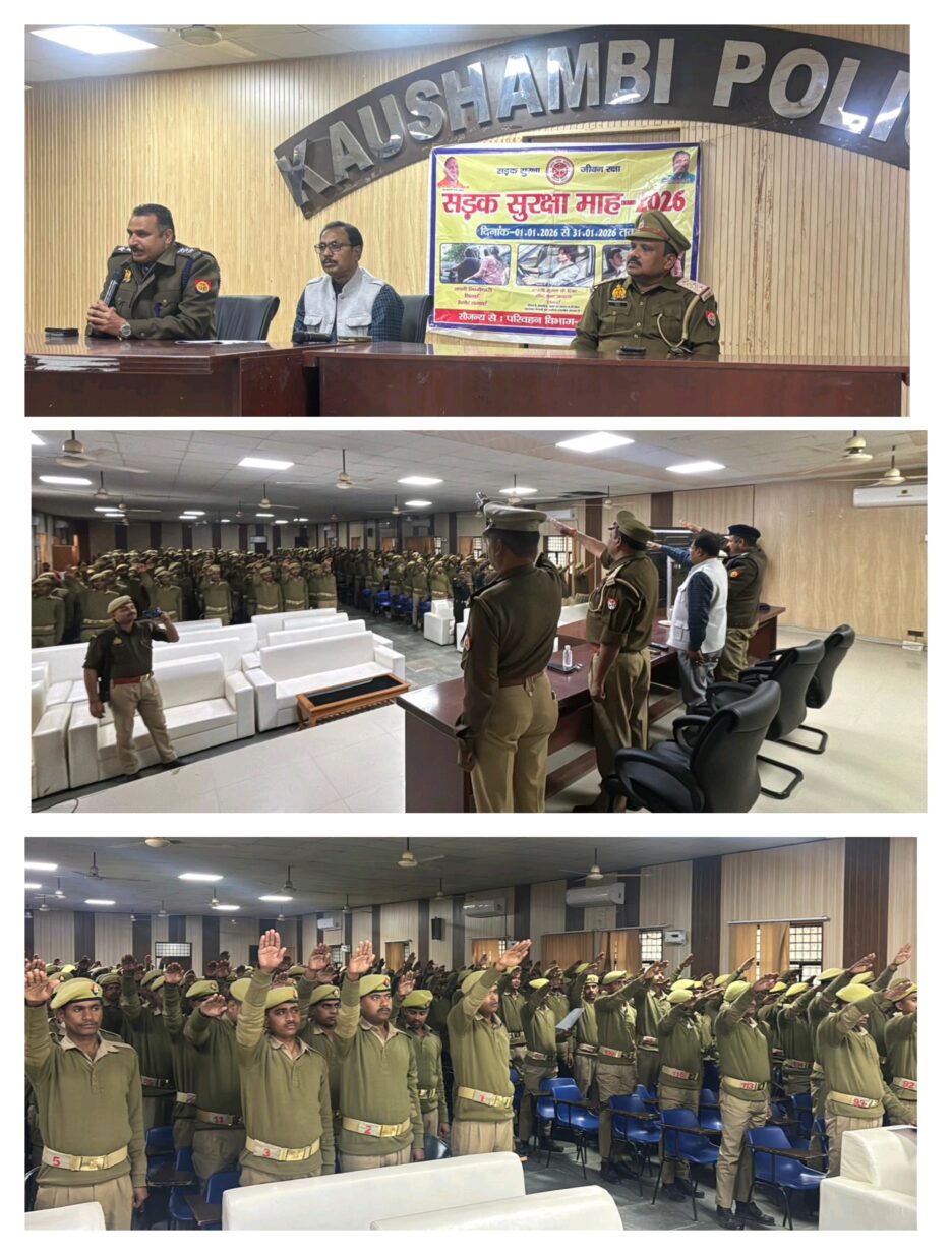 कौशाम्बी: सड़क सुरक्षा माह के अंतर्गत पुलिस लाइन में आयोजित हुआ जागरूकता कार्यक्रम,पुलिसकर्मियों को दिलाई गई सड़क सुरक्षा की शपथ,