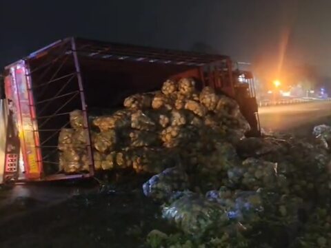 सब्जी लोडकर जा रहे ट्रक का टायर फटा,अनियंत्रित होकर पलटा ट्रक,हाइवे पर फैली सब्जियां,5 लाख का हुआ नुकसान