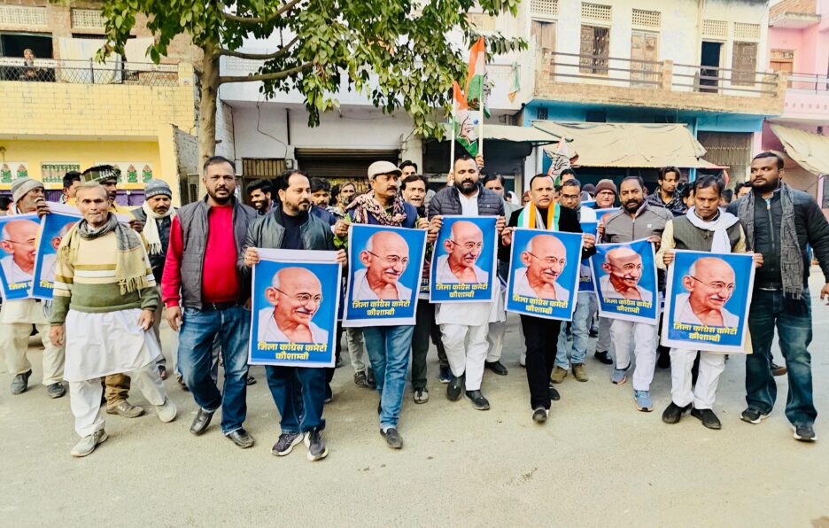 कांग्रेस पार्टी के कार्यकर्ताओं ने भरवारी स्थित जिला उपाध्यक्ष मोहम्मद अकरम के कार्यालय से भरवारी स्टेशन तक महात्मा गांधी के फोटो के साथ मनरेगा का नाम बदलने के विरोध में मार्च निकाल कर विरोध प्रदर्शन किया
