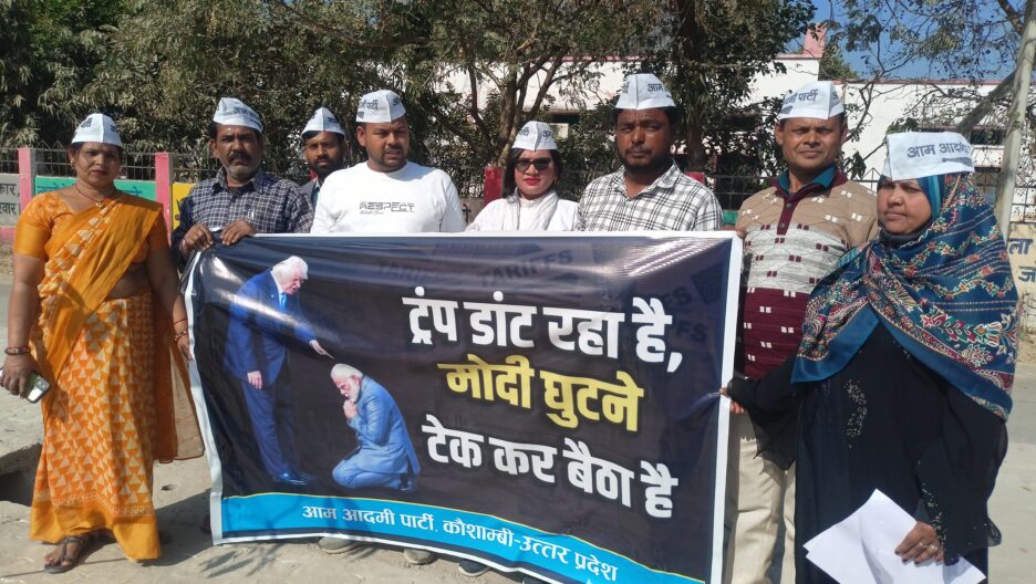 आम आदमी पार्टी के दर्जनों कार्यकर्ताओं ने डायट मैदान में प्रदर्शन किया। इस दौरान आप कार्यकर्ताओं ने एक पोस्टर लेकर प्रदर्शन किया, जिस पर “ट्रंप डांट रहा है मोदी घुटने टेक कर बैठा है” लिखा हुआ था, लेकर कार्यकर्ता डायट मैदान पहुंचे और प्रदर्शन के पश्चात राज्यपाल को सम्बोधित ज्ञापन एसडीएम मंझनपुर आकाश सिंह को सौंपा।